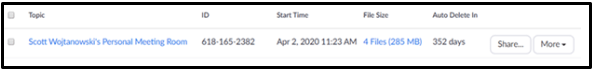 - Navigate to https://minnstate.zoom.us/recording and choose the “Share…” button next to your recording.