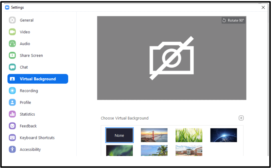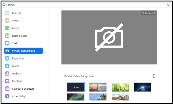 - In the Settings dialog box click “Virtual Background”
